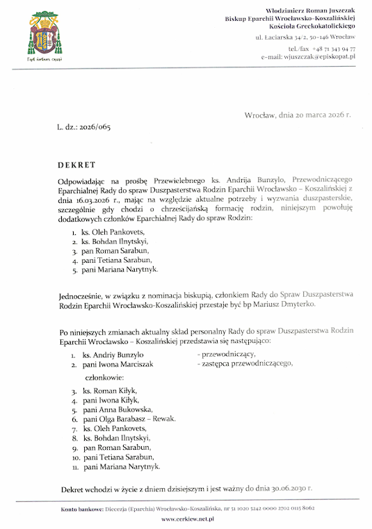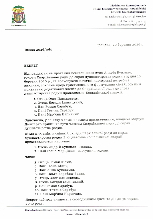 Владика Володимир призначив нових членів Комісії зі Справ Родин.23 marca 2026Życie eparchii0 KomentarzyДекретом від 20.03.2026 року Преосвященний Владика Володимир Ющак призначив нових членів Комісії зі справ родин. Podziel się tym z innymi Share this content Opens in a new window Opens in a new window Opens in a new window Opens in a new window Może ci się spodobać również «Глобальна Церква потребує глобального університету», — ректор УКУ на Синоді Єпископів УГКЦ 19 lipca 2024 В свято Благовіщення церковний Устав приписує служити вечірню з Літургією св. Йоана Золотоустого 24 marca 2025 Владика Володимир Ющак: 40 років служіння Богові й українцям, що живуть не на рідній землі 22 maja 2023Dodaj komentarz Anuluj pisanie odpowiedziCommentEnter your name or username to commentEnter your email address to commentEnter your website URL (optional) Zapamiętaj moje dane w tej przeglądarce podczas pisania kolejnych komentarzy.